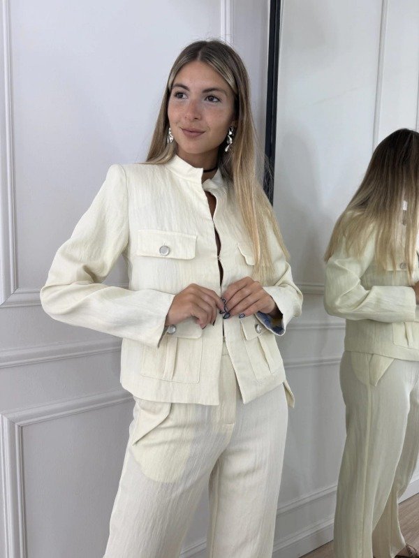 Confeccionada en twill sastrero de estilo arrugado, posee prendedores metálicos invisibles que aportan un acabado limpio y elegante.