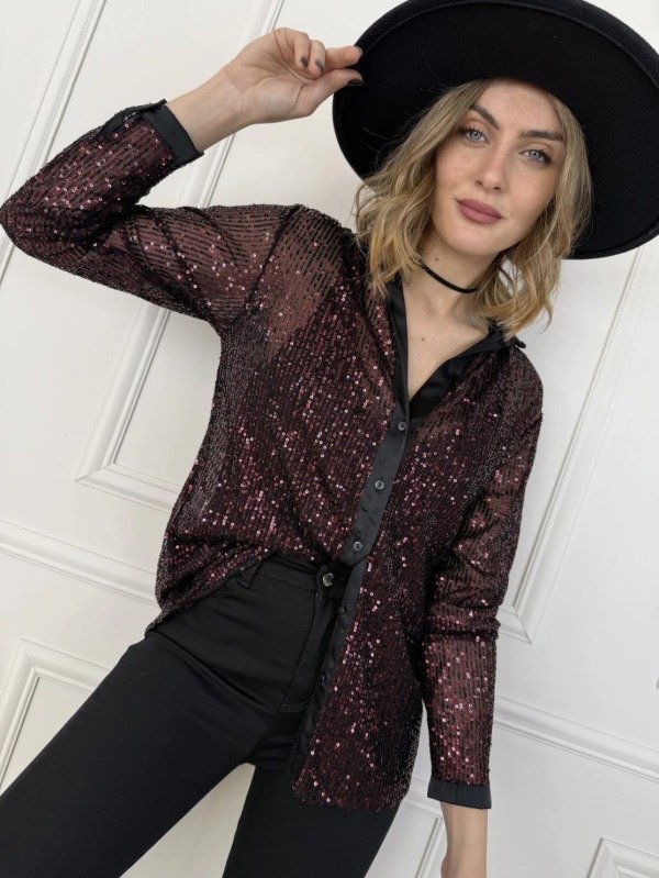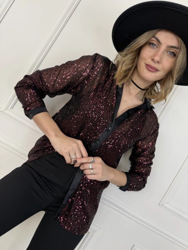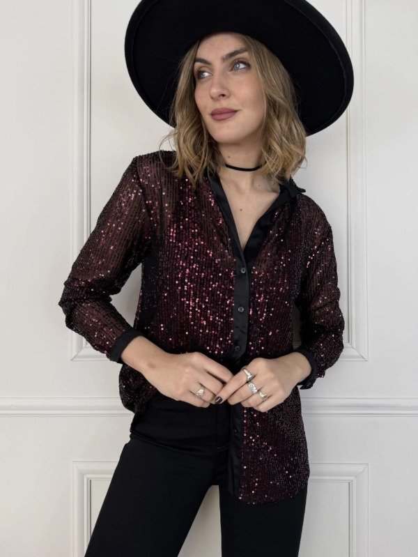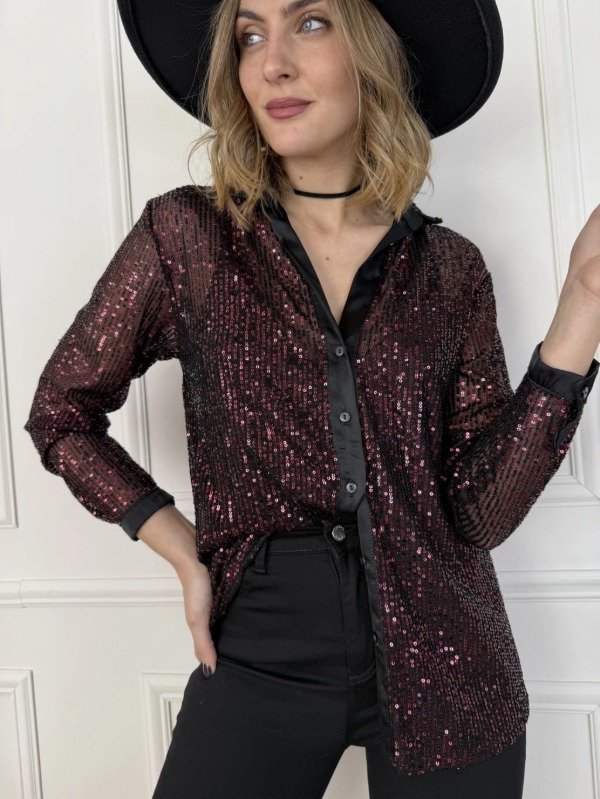 Camisa Cloe, confeccionada en paillette, esta camisa deslumbra con su brillo único, perfecto para destacar en cualquier ocasión especial. El diseño se realza con un cuello camisero clásico, mientras que las terminaciones al bies con raso aportan un toque sofisticado y delicado. Los puños y el cierre delantero con botones aseguran un ajuste cómodo y práctico, realzando la silueta con distinción. La Camisa Marlen es ideal para combinar con pantalones de vestir o faldas, logrando un look audaz y elegante.