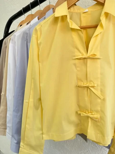 Camisa cropp con detalle de lazos para atar en cartera. Lleva subemanga con boton para arremangar a 3/4.