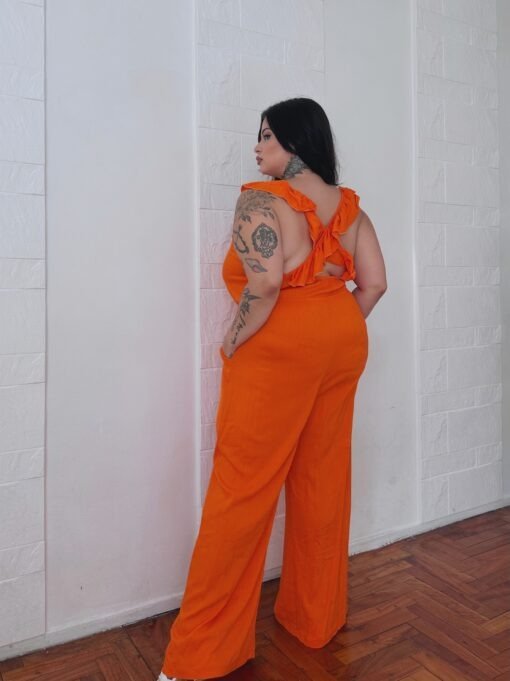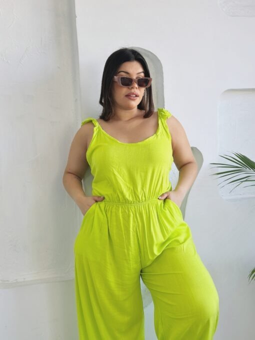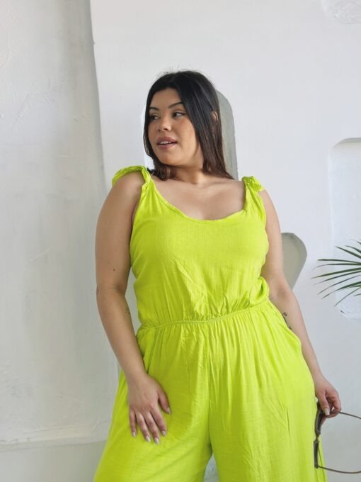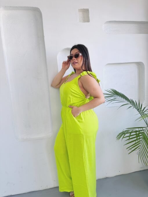 Mono palazzo largo de lino lycra con bolsillo y atrás cruzado volado.