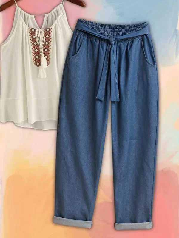 El pantalón está fabricado en bengalina símil jeans elastizada de excelente calidad. Posee bolsillos a los costados y cinto para regular. Vienen en talle Unico y cede hasta un XL