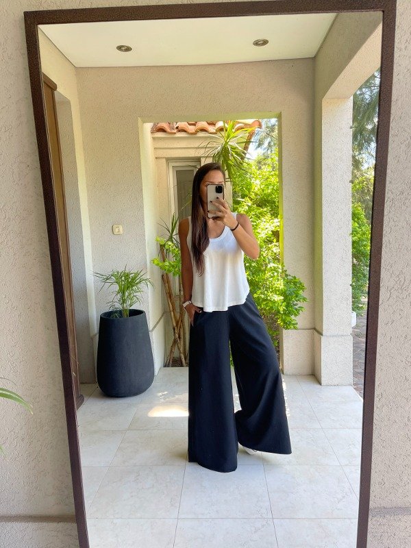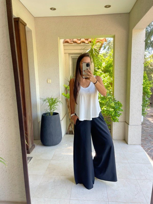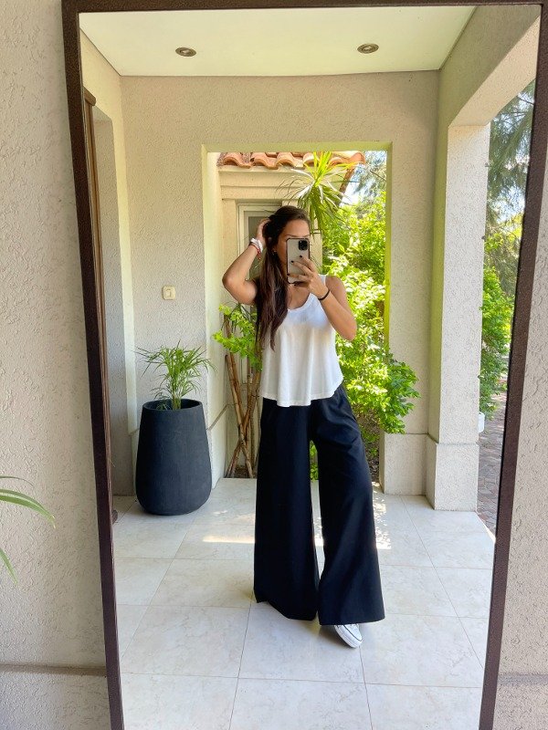 Palazo tipo Oxford, confeccionado en tela de algodón rústico, con bolsillos laterales. Y cintura elastizada.
