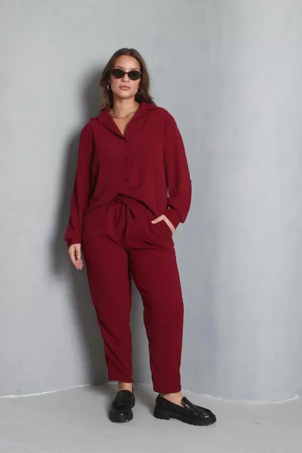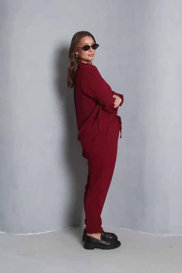 Pantalón confeccionado en crepe cey arrugado, tipo mom.