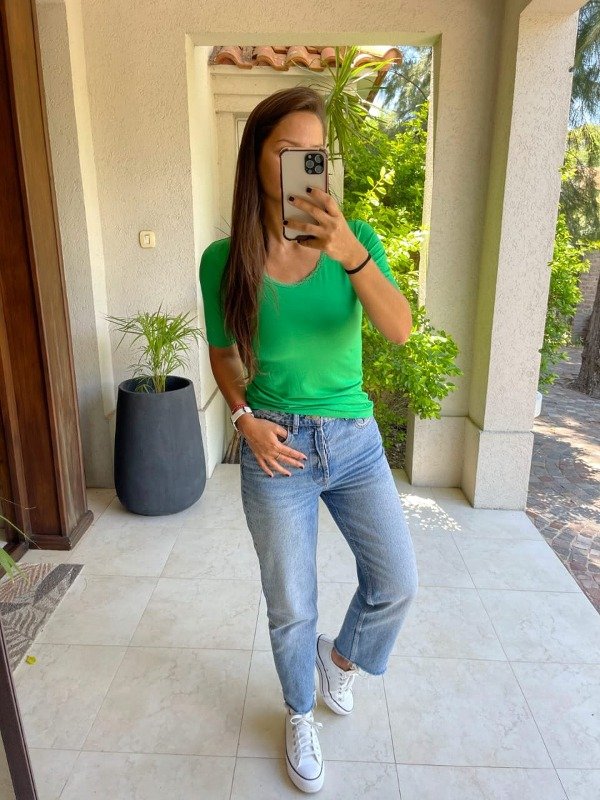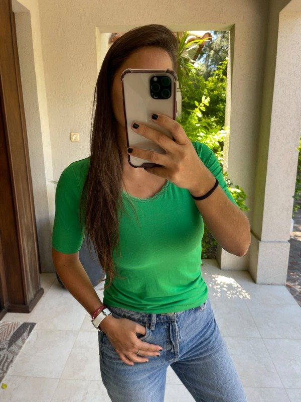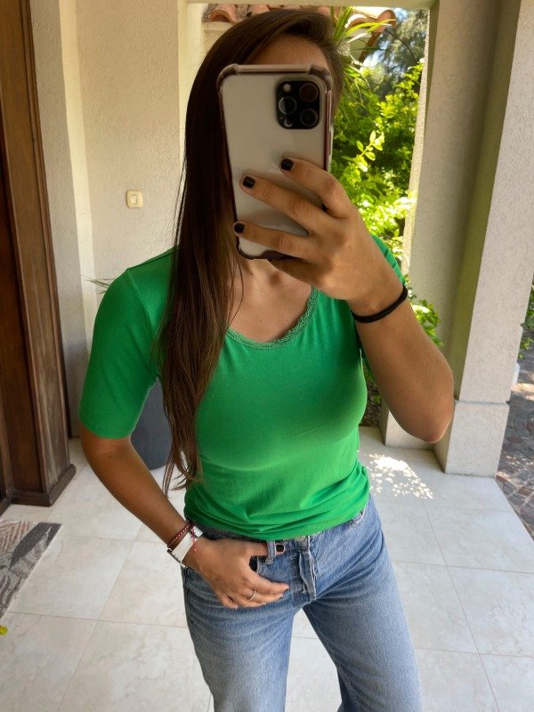 Remera manga corta confeccionada en modal viscosa, con detalle de puntilla en cuello escote redondo