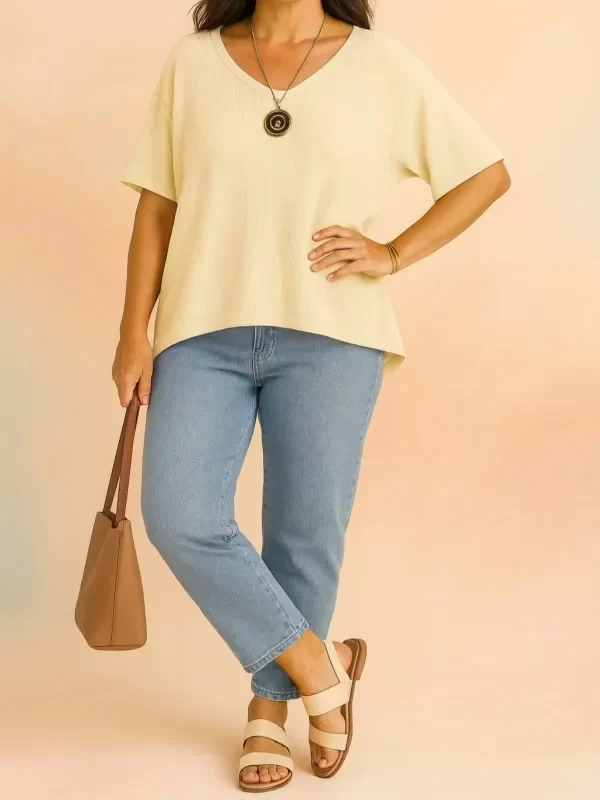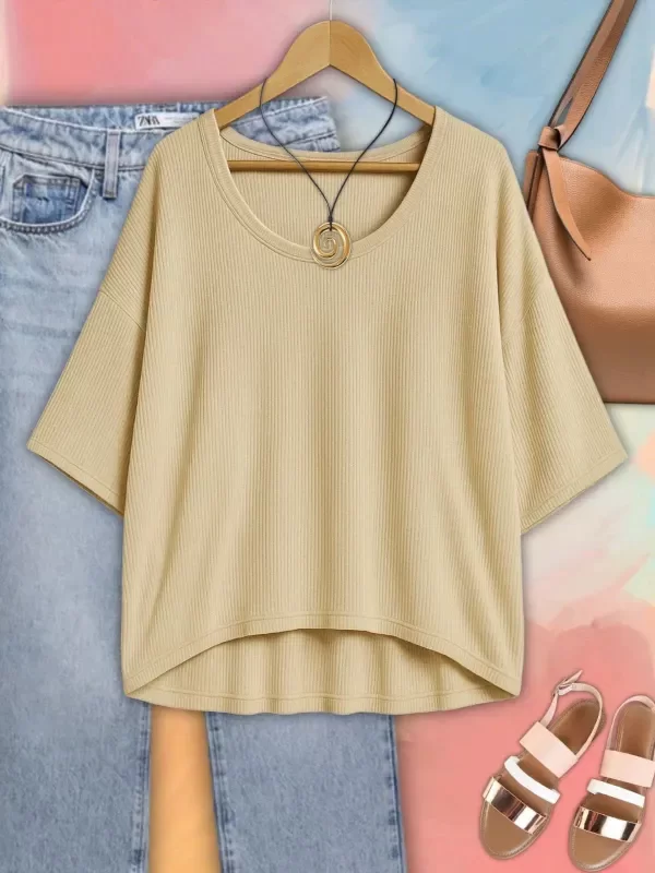 La remera esta fabricada en tela micro morley. Es talle Unico, el modelo es suelto y la tela es elastizada, cede hasta un XL.