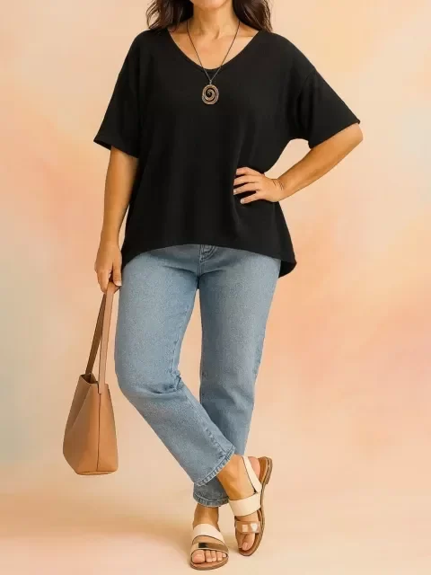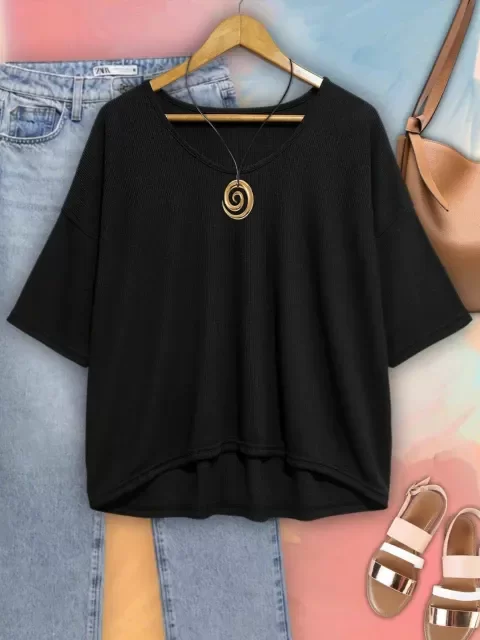 La remera esta fabricada en tela micro morley. Es talle Unico, el modelo es suelto y la tela es elastizada, cede hasta un XL.