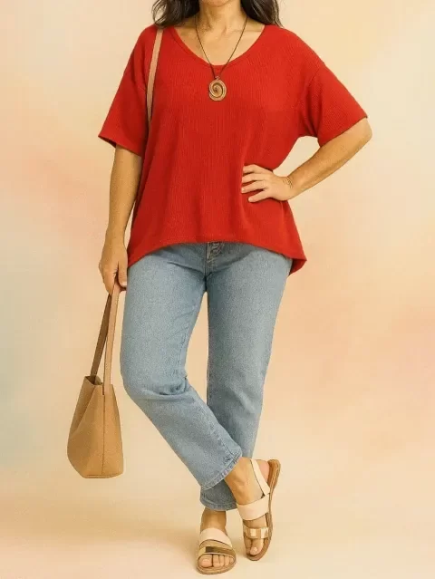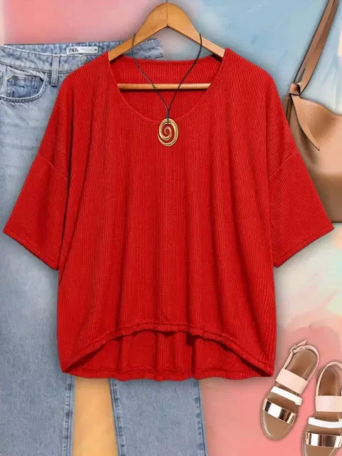 La remera esta fabricada en tela micro morley. Es talle Unico, el modelo es suelto y la tela es elastizada, cede hasta un XL.