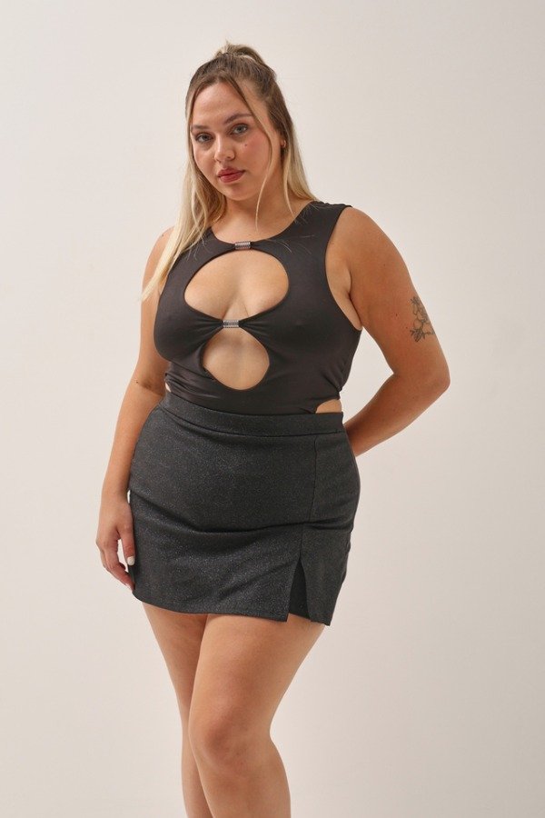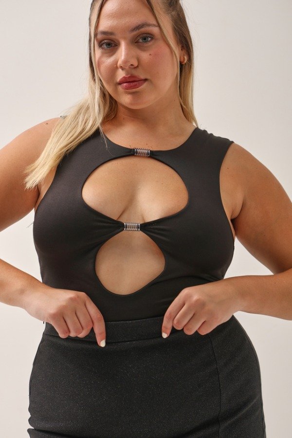 Body cuello redondo sin mangas, sustracciones en vientre y pecho, con accesorio enillado. Tiene ganchitos para abrochar en la parte baja.