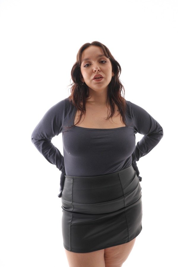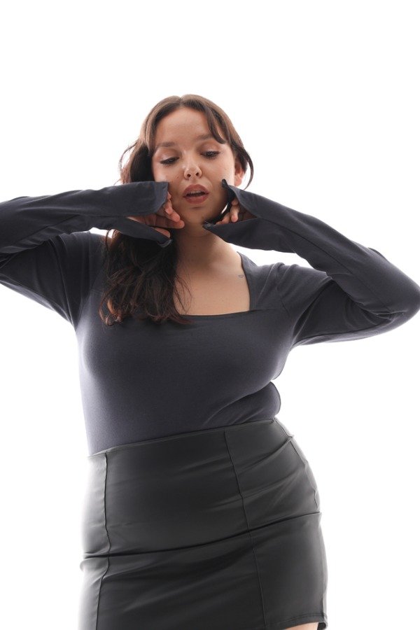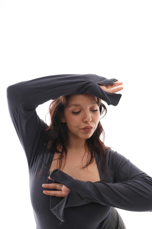 Body básico, escote cuadrado y mangas largas con caída sobre la mano.